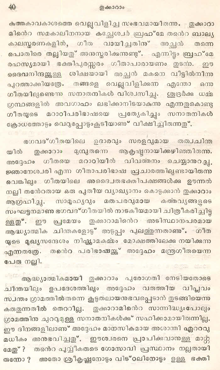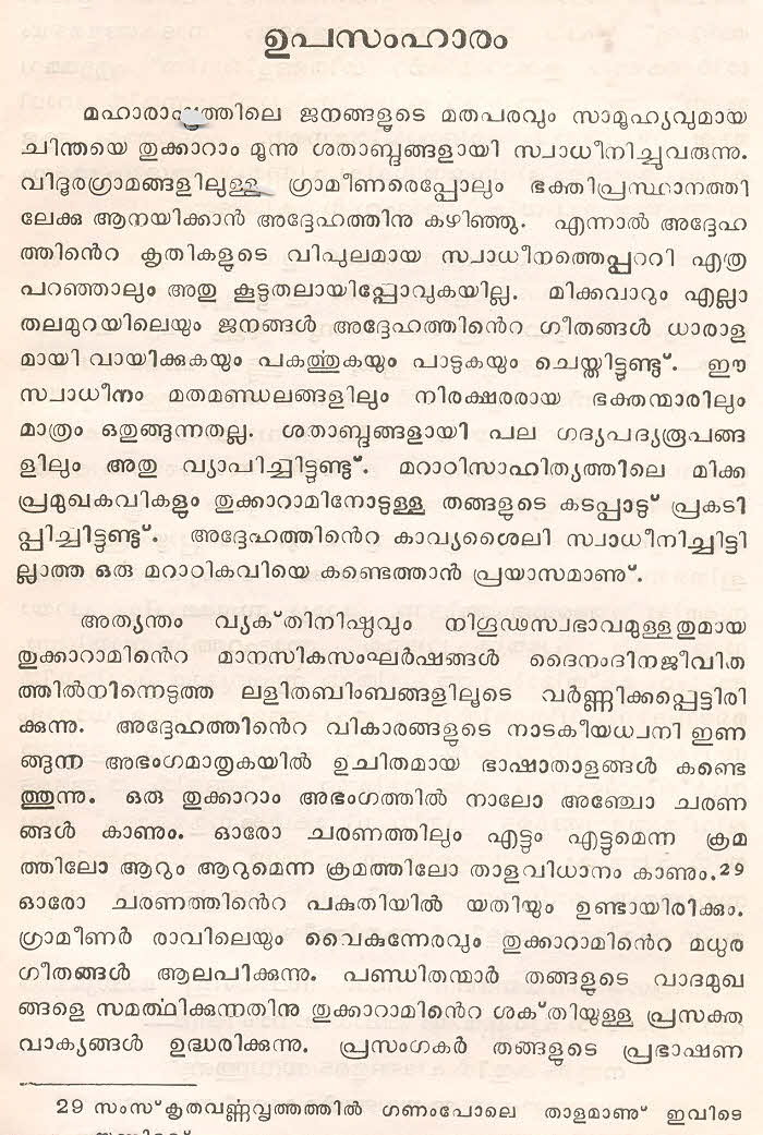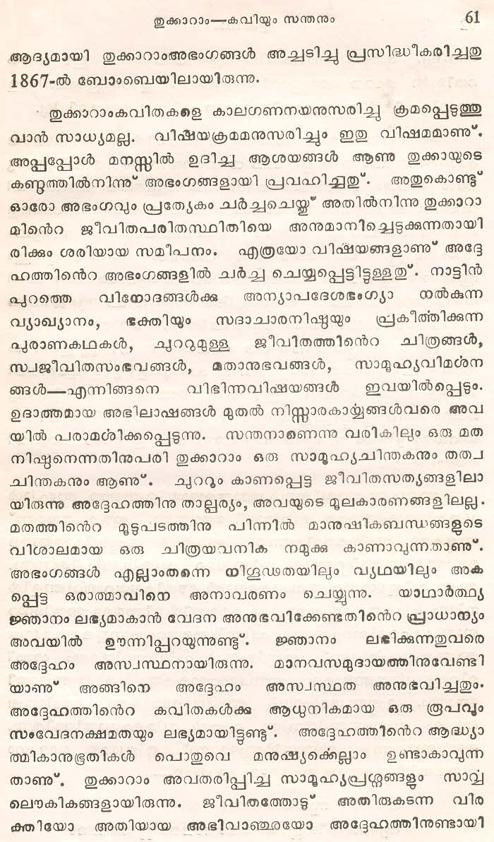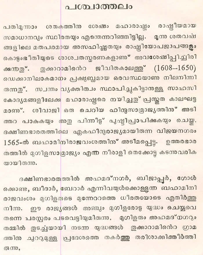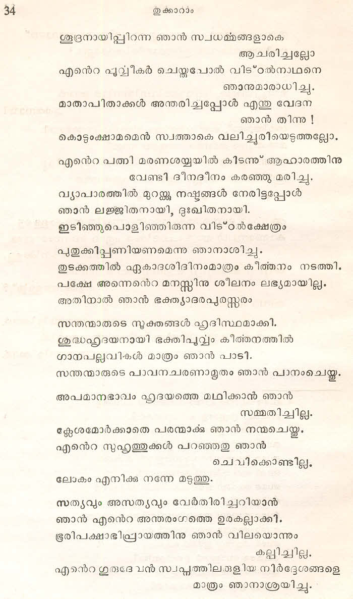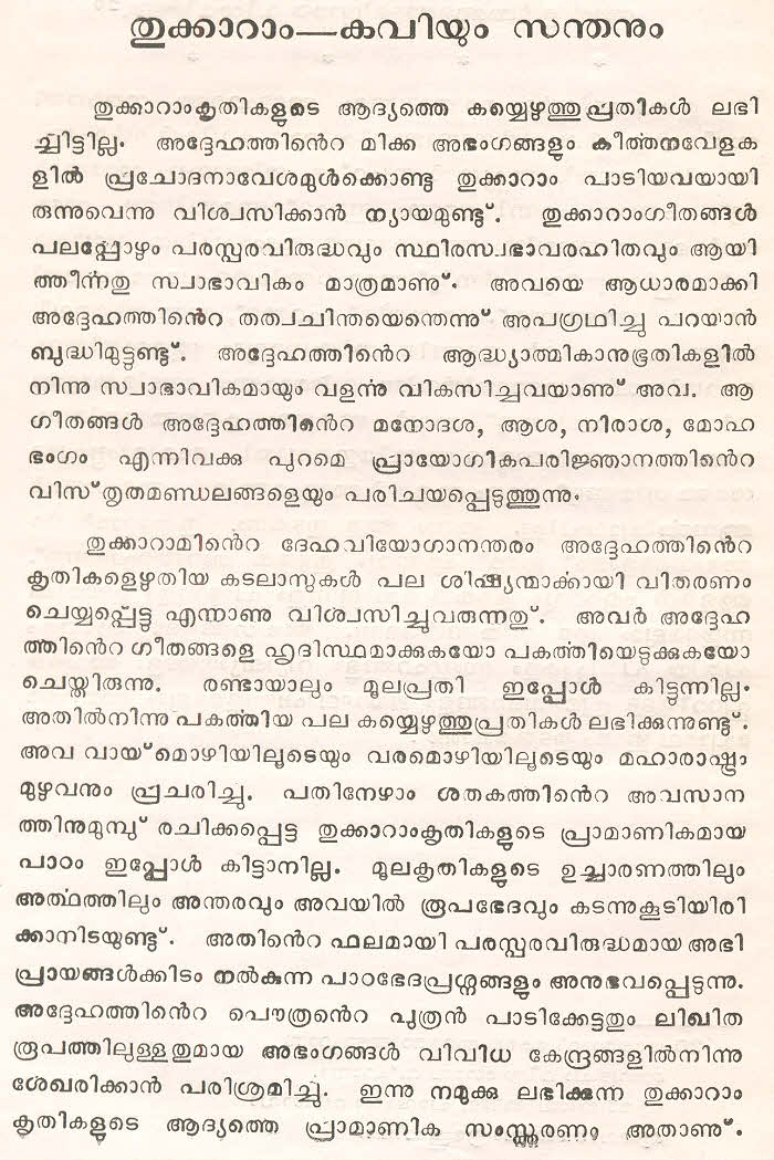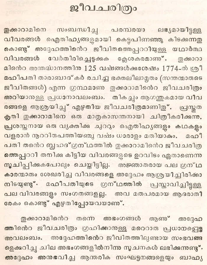 സന്ത് തുക്കാറാം മഹാറാജിന്റെ തെരഞ്ഞെടുത്ത മറാഠി അഭംഗങ്ങള് മലയാളം ഭാഷയില് ലിപ്യന്തരണം ചെയ്ത് അര്ത്ഥസംഗ്രഹത്തോടൊപ്പം ഈ സമാഹരത്തില് ഉള്പ്പെടുത്തിയിട്ടുണ്ട്. ഇത് ഒരു എളിയ സംരംഭമാണ്. തുക്കാറാം മഹാറാജിന്റെ കൂടുതല് അഭംഗങ്ങളും, സന്ത് ജ്ഞാനേശ്വര്, സന്ത് നാംദേവ്, സന്ത് ഏക്നാഥ് എന്നീ ഭക്തകവികളുടെ അഭംഗങ്ങളും ഇതുപോലെ സജ്ജന സമക്ഷം എത്തിക്കാന് കഴിയട്ടെ എന്ന് പ്രാര്ത്ഥിക്കുന്നു.