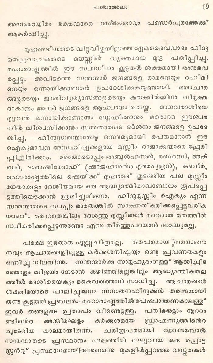 ഭക്തിസാധനയുടെ ഭാഗമായുള്ള ഭജന കീര്ത്തന ആലാപന സമ്പ്രദായം നമ്മുടെ സംസ്കാരത്തിന്റെ ഭാഗമാണ്. പാരമ്പര്യമായി നാം ആ രീതി പിന്തുടര്ന്നു വരുന്നു. ജ്ഞാനേശ്വര്, നാംദേവ്, ഏക്നാഥ്, തുക്കാറാം, മുക്താഭായി, ജനാഭായി, ജനാര്ദ്ദന് മഹാരാജ്, ഭാനുദാസ്, സോപാന്ദേവ്, ചൊഖാമേലാ, കാനോഭാ, നരഹരിസോനാര്, ഗോരകുംഭാര്, കബീര്ദാസ്, സൂര്ദാസ്, സമര്ത്ഥ് രാംദാസ് എന്നീ ഭക്തകവികളുടെ അഭംഗങ്ങളും ദോഹകളും നമുക്ക് സുപരിചിതങ്ങളാണ്.