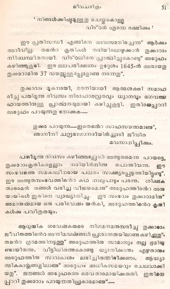 തുക്കാറാം പറയുന്നു, അങ്ങയുടെ ചരണങ്ങളില് വന്ദിക്കുവാന് സാധിക്കുക അതാണ് എന്റെ സമ്പത്ത്. എന്റെ ചിത്തത്തെ അങ്ങയുടെ സമക്ഷം സമര്പ്പിച്ചുകൊണ്ട് ആ സൗഭാഗ്യത്തിന്റെ കീഴില് ഞാന് കഴിയുന്നു. ഭഗവാനേ, എന്നെപോലുള്ള അനാഥ ജീവിതങ്ങളെ അങ്ങ് സംരക്ഷിക്കുന്നു. അങ്ങയുടെ ദാസന് ഈ തുക്കാറാം കൈകള് രണ്ടും ചേര്ത്തുപിടിച്ചുകൊണ്ട് വിനയത്തോടെ നമിക്കുന്നു.