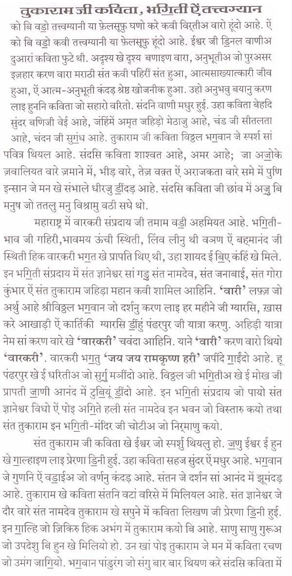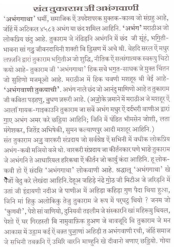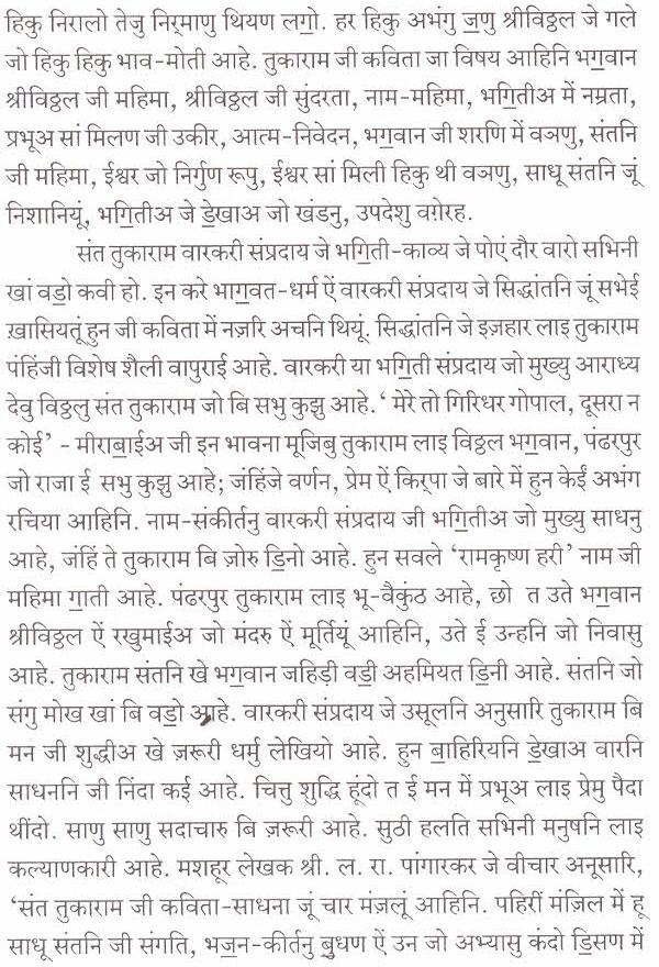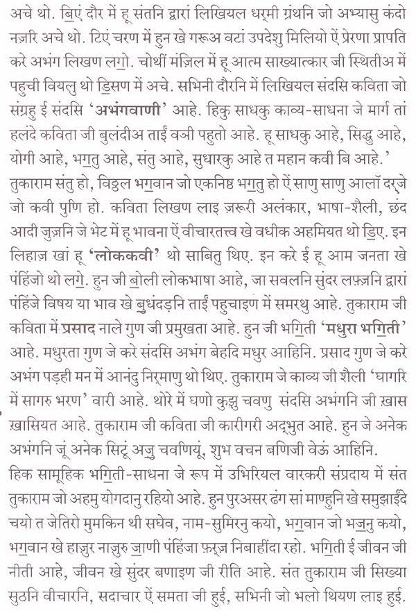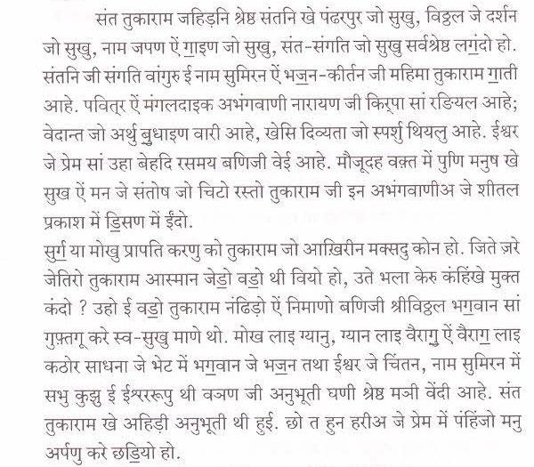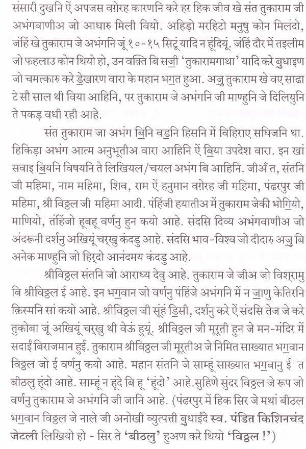 पंहिंजी चेल्हि ते हथ रखी बीठल भग॒वान श्रीविठ्ठल(पांडुरंग) जो रूपु सुंदरु आहे. गले में तुलसीअ जो हारु पातल ऐं कमरि में पीताम्बरु पहिरियल श्रीविठ्ठल भग॒वान जो सुहिणो रूपु मूंखे सदाईं वणंदो आहे. संदसि कननि में मछीअ जे आकार जह़िडा कुंढल ऐं गि॒चीअ वारो कौस्तुभ मणी सुहिणो लगी॒ रहियो आहे. संत तुकाराम चवे थो त श्रीविठ्ठल भग॒वान जो इहो सुंदर रूपु मुंहिंजो सारो सुखु आहे. मां इहो मुखु प्यार सां डि॒संदुसि.