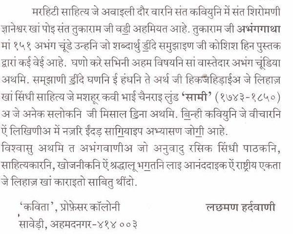 प्रो. लछमण हर्दवाणी जे लिखियल पुस्तक ’संत तुकारामजी अभंगवाणी’ अ जो महूरतु देहू (पुणे) जे इंद्रायणी नदीअ जे किनारे ते आमदार श्री. अनिल राठोड़ जे हथां ३१ मार्च, २००५ ते थियो. इन पुस्तक में संत तुकाराम जे १५१ अभंगनि जो अर्थु ऐं समझाणी देवनागरी सिंधीअ में डि॒नी वेई आहे.